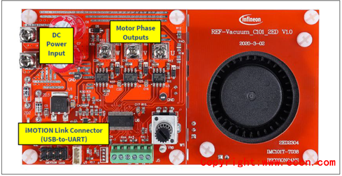 The REF-Vacuum-C101-2ED is part of the iMOTION™ reference design kits. It is designed to provide ready-to-use, low-voltage and high-speed vacuum solutions based on Infineons thin-film SOI technology and advanced motion control engine (MCE 2.0) technology. It allows fast prototyping and fast time to market. The board is equipped with all assembly groups for sensorless field-oriented control (FOC), and reserved interface for three digital Hall sensors, so that it can be extended to other low-voltage and high-current motor applications.