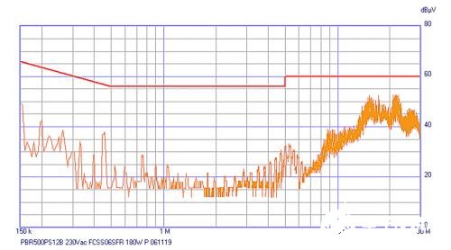 作為實驗,XPPower的PBR500PS12B型AC-DC轉(zhuǎn)換器的EMI性能在230VAC和180W負載下繪制,結(jié)果如圖2所示。根據(jù)標準要求,轉(zhuǎn)換器符合EN55032曲線B級輻射限值,具有良好的裕度,用于準峰值檢測。增加了一個額外的濾波器,型號為XPPowerFCSS06SFR,衰減特性如圖3所示。實線是共模和虛線差模衰減。