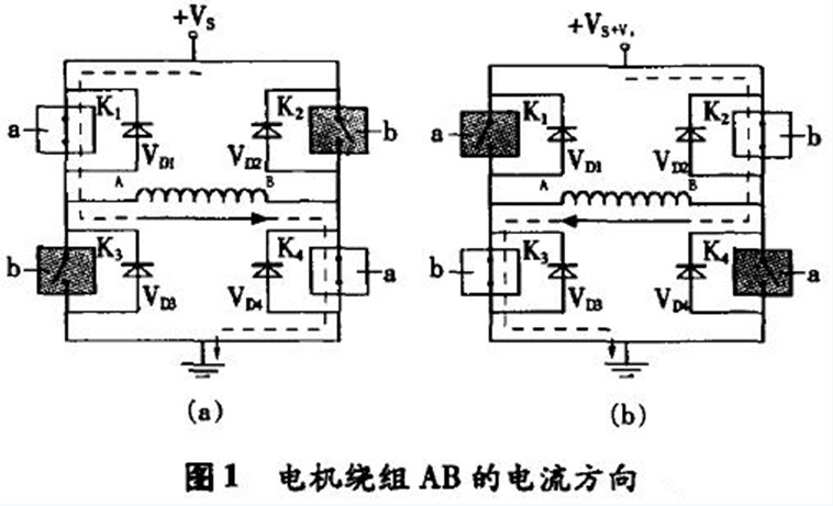 4個(gè)開關(guān)K1和K4,K2和K3分別受控制信號a,b的控制,當(dāng)控制信號使開關(guān)K1,K4合上,K2,K3斷開時(shí),電流在線圈中的流向如圖1(a),當(dāng)控制信號使開關(guān)K2,K3合上,K1,K4斷開時(shí),電流在線圈中的流向如圖1(b)所示。4個(gè)二極管VD1,VD2,VD3,VD4為續(xù)流二極管,它們所起的作用是:以圖1(a)為例,當(dāng)K1,K4開關(guān)受控制由閉合轉(zhuǎn)向斷開時(shí),由于此時(shí)線圈繞組AB上的電流不能突變,仍需按原電流方向流動(即A→B),此時(shí)由VD3,VD2來提供回路。因此,電流在K1,K4關(guān)斷的瞬間由地→VD3→線圈繞組AB→VD2→電源+Vs形成續(xù)流回路。同理,在圖1(b)中,當(dāng)開關(guān)K2,K3關(guān)斷的瞬間,由二極管VD4,VD1提供線圈繞組的續(xù)流,電流回路為地→VD4→線圈繞組BA→VD1→電源+Vs。步進(jìn)電機(jī)驅(qū)動器中,實(shí)現(xiàn)上述開關(guān)功能的元件在實(shí)際電路中常采用功率MOSFET管。
