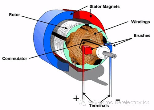 圖2:在有刷電機里,導電刷(用銅刷毛或更有可能是石墨塊制作而成)接觸轉子上的觸點。隨著轉子變向,它會切換周圍線圈電流的極性。(圖片來源:Microchip Webinar)