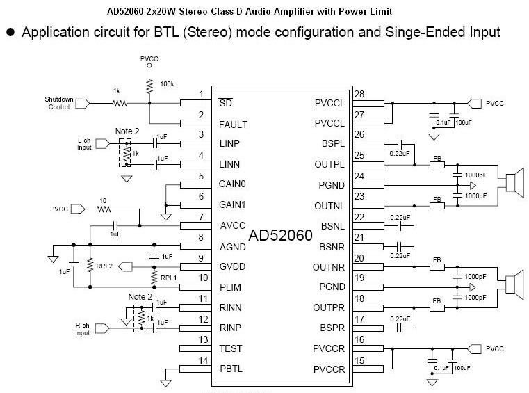 The AD52060 is a high efficiency stereo class-D audio amplifier with adjustable power limit function.