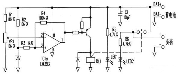 這個電路的結(jié)構(gòu)比較簡單,使用一個片常用的電壓比較器芯片-LM393。這是一個雙電壓比較器芯片,在這個電路中使用了其中的一片。這個電路的工作原理是:蓄電池除了給負(fù)載部分供電外,還會給這個電路提供電源。電壓比較器的同相輸入端由電阻R2通過穩(wěn)壓二極管穩(wěn)壓,經(jīng)過電阻R3提供基準(zhǔn)電壓,同時蓄電池電壓會經(jīng)過電阻R1以及可變電阻VR1的分壓輸入到電壓比較器的反相輸入端,這一路作為電池電壓的檢測,通過調(diào)節(jié)VR1使電壓在放電保護電壓。正常工作時,反相輸入端的電壓會高于同相輸入端,比較器的輸出端會輸出低電平,驅(qū)動外接的PNP三極管導(dǎo)通,繼電器線圈得電工作,常開觸點閉合,蓄電池會給負(fù)載供電。