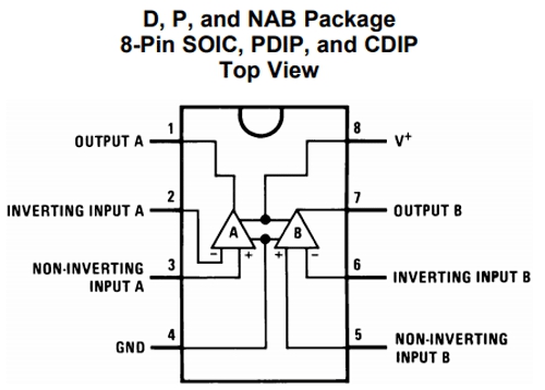 該設(shè)計(jì)加入了可調(diào)的過流閾值,同時(shí)還有失效時(shí)自動(dòng)重啟功能。因?yàn)檫@是一個(gè)基于運(yùn)放的過流保護(hù)電路,所以我們加入了運(yùn)放作為驅(qū)動(dòng),這里用的是常見的LM358。下圖為L(zhǎng)M358的引腳圖。