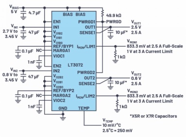 LT3072在單個(gè)封裝中集成了兩個(gè)完全獨(dú)立的2.5 A LDO穩(wěn)壓器。LT3072的0.6 V至2.5 V輸出電壓范圍足夠?qū),能夠(yàn)楦鞣N數(shù)字IC供電軌供電。在LT3072上設(shè)置幾個(gè)三態(tài)引腳,可編程設(shè)定每個(gè)通道的輸出電壓,這可通過跳線、微控制器或電源系統(tǒng)管理(PSM) IC輕松實(shí)現(xiàn)。