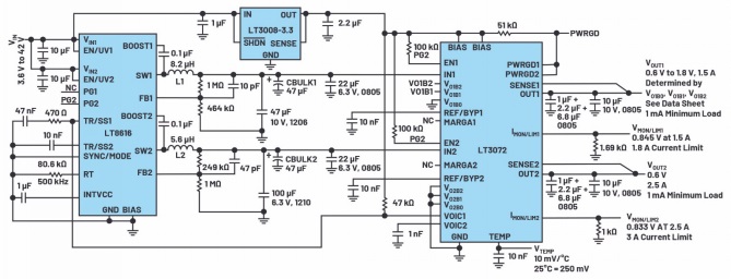 圖3.LT3072的IN1和IN2由雙通道、降壓型LT8616進(jìn)行預(yù)調(diào)節(jié)。LT3072的VOIC1和LT8616的TR/SS1之間的連接允許LT3072動(dòng)態(tài)預(yù)調(diào)節(jié)其IN1輸入,從而獲得出色的效率和負(fù)載瞬變性能,同時(shí)允許在不更改硬件的情況下調(diào)整LT3072的輸出電壓。
