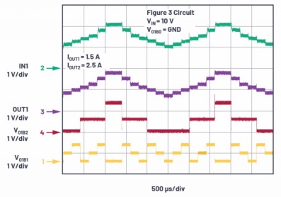 圖4.圖3所示電路的動(dòng)態(tài)測(cè)試。跡線顯示,通過軟件對(duì)三態(tài)引腳VO1B2和VO1B1(VO1B0接地)進(jìn)行更改如何實(shí)現(xiàn)對(duì)LT3072的OUT1電壓調(diào)整。反過來(lái),LT3072動(dòng)態(tài)控制LT8616通道1輸出,該輸出對(duì)LDO穩(wěn)壓器的IN1輸入進(jìn)行預(yù)調(diào)節(jié)。這樣,LDO穩(wěn)壓器的IN1電壓保持在一個(gè)高于LDO穩(wěn)壓器OUT1的固定壓差,從而可實(shí)現(xiàn)高效率和高負(fù)載瞬變性能,所有這一切無(wú)需對(duì)硬件進(jìn)行任何更改。