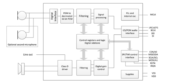 與麥克風的接口長期以來一直由語音編解碼器實現(xiàn),但傳統(tǒng)的編解碼器被設(shè)計為與駐極體麥克風兼容,而不兼容現(xiàn)代數(shù)字MEMS麥克風。之前的語音編解碼器缺少與MEMS麥克風端接所需的許多功能,其中包括抽取濾波(decimation filtering),其作用是將PDM轉(zhuǎn)換為PCM格式以便進一步處理。此外,在包括揚聲器和麥克風陣列在內(nèi)的許多應(yīng)用中,具有更高效率的D類放大器已成為任何MEMS麥克風接口的重要組成部分。