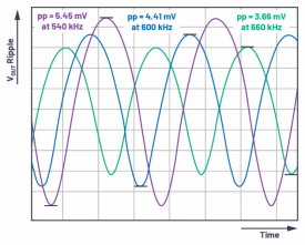 圖3.在開關(guān)模式穩(wěn)壓器IC中,開關(guān)頻率變化導(dǎo)致的輸出電壓紋波變化