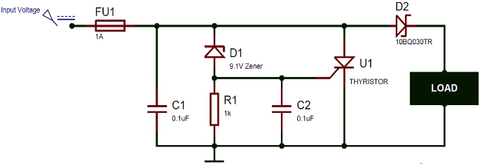 而何種電壓下產(chǎn)生短路則取決于齊納電壓。電路由一個晶閘管構(gòu)成,晶閘管會直接連在輸入電壓和地之間,但晶閘管因為門極接地所以默認(rèn)為關(guān)斷狀態(tài)。當(dāng)輸入電壓超過齊納電壓后,齊納二極管導(dǎo)通,因此電壓加到晶閘管門極,使得輸入電壓與地之間產(chǎn)生短路。短路會從電源中產(chǎn)生龐大的電流,從而熔斷保險絲,使得負(fù)載與電源斷開。