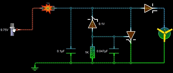以上圖片展示了過壓保護的過程。電壓增加到9.75V后,保險絲熔斷。其中每一個元器件的功能如下: