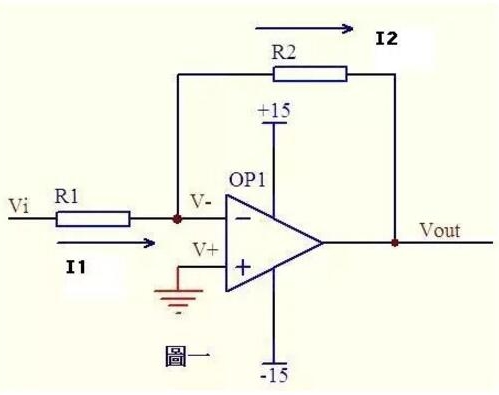 圖一運(yùn)放的同向端接地=0V,反向端和同向端虛短,所以也是0V,反向輸入端輸入電阻很高,虛斷,幾乎沒有電流注入和流出,那么R1和R2相當(dāng)于是串聯(lián)的,流過一個(gè)串聯(lián)電路中的每一只組件的電流是相同的,即流過R1的電流和流過R2的電流是相同的。流過R1的電流I1=(Vi-V-)/R1……a流過R2的電流I2=(V--Vout)/R2……bV-=V+=0……cI1=I2……d求解上面的初中代數(shù)方程得Vout=(-R2/R1)*Vi這就是傳說中的反向放大器的輸入輸出關(guān)系式了。