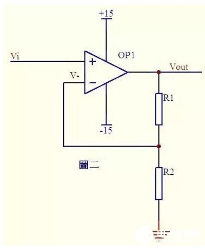 圖二中Vi與V-虛短,則Vi=V-……a因?yàn)樘摂,反向輸入端沒有電流輸入輸出,通過R1和R2的電流相等,設(shè)此電流為I,由歐姆定律得:I=Vout/(R1+R2)……bVi等于R2上的分壓,即:Vi=I*R2……c由abc式得。Vout=Vi*(R1+R2)/R2這就是傳說中的同向放大器的公式了。