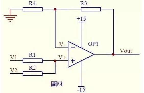 圖四。因?yàn)樘摂,運(yùn)放同向端沒有電流流過,則流過R1和R2的電流相等,同理流過R4和R3的電流也相等。故(V1–V+)/R1=(V+-V2)/R2……a(Vout–V-)/R3=V-/R4……b由虛短知:V+=V-……c如果R1=R2,R3=R4,則由以上式子可以推導(dǎo)出V+=(V1+V2)/2V-=Vout/2故Vout=V1+V2也是一個(gè)加法器。