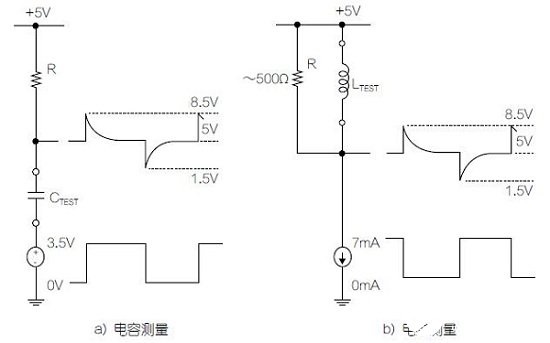 關(guān)于該電路的運(yùn)行,首先請看圖1中所示的基本原理圖。在圖1a中,方波電壓源驅(qū)動被測電容器的底部端子。頂部端子電壓為一系列在+5V電源軌上下呈指數(shù)衰減的正向和負(fù)向脈沖。衰減時間常數(shù)自然為R和CTEST的乘積。同樣地,在圖1b中,方波電壓源饋入被測電感器,從而在+5V電源軌上下引起類似的瞬變,此時衰減時間常數(shù)則等于LTEST/R。在電壓呈指數(shù)衰減的過程中,被占用方波的兩個半周各自的比例由時間常數(shù)和振蕩周期之間的關(guān)系決定。