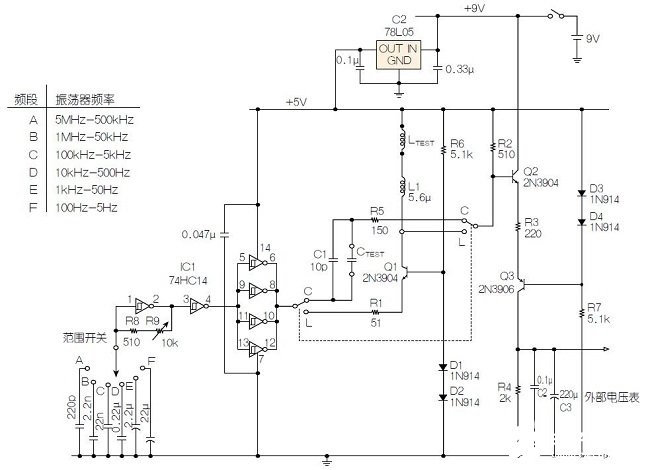 但是,要想覆蓋這么大的值域,會稍微有點(diǎn)麻煩,因?yàn)橐_定被測器件的值,您需要先調(diào)節(jié)可變電阻器,然后再查看校正曲線上對應(yīng)的電容值或電感值,而不是直接讀數(shù)。