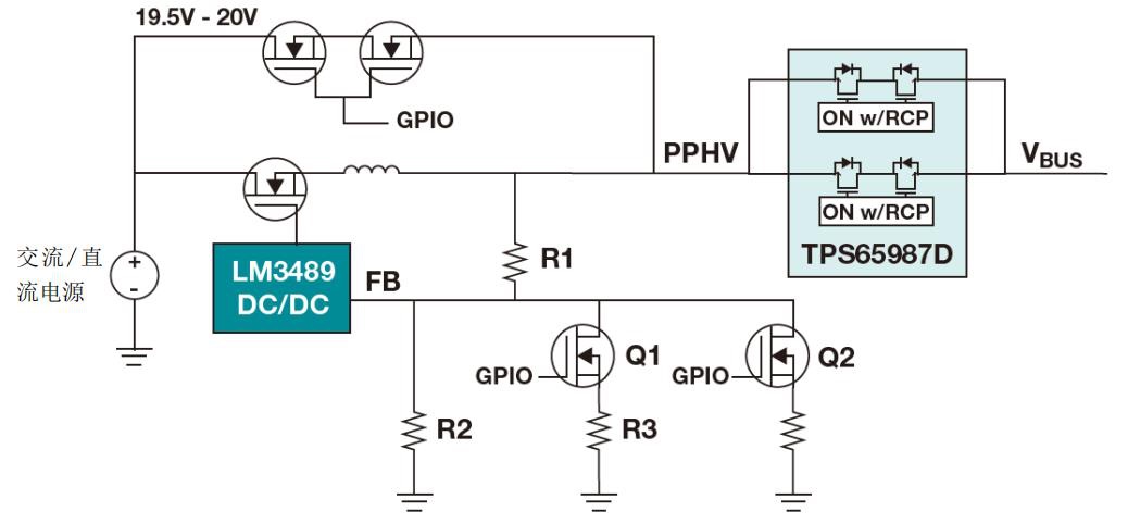 對于這個具體的設(shè)計示例,我會使用 TI 的 LM3489 磁滯 p 溝道 FET(PFET)控制器。該集成電路(IC)允許外部 PFET 上 100%的占空比,可直接從 AC/DC 轉(zhuǎn)換器通過外部 19.5 V。市場上大多數(shù) USB PD 控制器都具有通用輸入/輸出(GPIO),用于控制外部穩(wěn)壓器輸出電壓。PD 控制器可以通過調(diào)節(jié)降壓的反饋網(wǎng)絡(luò)來調(diào)整 LM3489 DC/DC 降壓轉(zhuǎn)換器的輸出電壓。