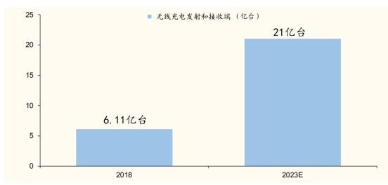 根據(jù) IHS的數(shù)據(jù)顯示,2018 年無線充電發(fā)射端、接收端出貨量達(dá) 6.11 億臺(tái),預(yù)計(jì)到2023年,無線充電發(fā)射端、 接收端的出貨量將達(dá)21億臺(tái),五年CAGR(復(fù)合年均增長(zhǎng)率)將達(dá) 28%。