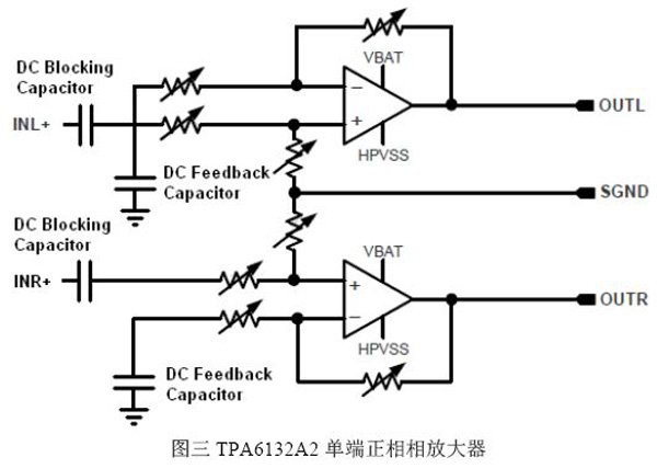 | TI提供的TPA6132A2,因?yàn)槠?00dB 的高信噪比,0.01%的低失真度,出色的消除POP聲的能力,以及極高的性?xún)r(jià)比,在手機(jī)等移動(dòng)設(shè)備中,得到了廣泛的應(yīng)用。由于移動(dòng)設(shè)備芯片的集成度的提高,越來(lái)越多的芯片組選擇了單端的連接方式作為耳機(jī)通道輸出。TPA6132A2 同時(shí)提供了差分,以及單端反相放大的連接方式。但由于一些應(yīng)用,例如需要配合其他播放設(shè)備使用,對(duì)于輸出的相位有嚴(yán)格的要求,因此需要以正向的單端放大器的連接方式連接TPA6132A2。本文將討論TPA6132A2 的正向單端放大器的連接方法,以及需要注意的事項(xiàng)。