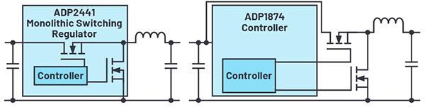 開(kāi)關(guān)穩(wěn)壓器可以采用單片結(jié)構(gòu),也可以通過(guò)控制器構(gòu)建。在單片式開(kāi)關(guān)穩(wěn)壓器中,各功率開(kāi)關(guān)(一般是MOSFET)會(huì)集成在單個(gè)硅芯片中。使用控制器構(gòu)建時(shí),除了控制器IC,還必須單獨(dú)選擇半導(dǎo)體和確定其位置。選擇MOSFET非常耗費(fèi)時(shí)間,且需要對(duì)開(kāi)關(guān)的參數(shù)有一定了解。使用單片式設(shè)計(jì)時(shí),設(shè)計(jì)人員無(wú)需處理這些問(wèn)題。此外,相比高度集成的解決方案,控制器解決方案通常會(huì)占用更多的電路板空間。所以,毫不意外多年來(lái)人們?cè)絹?lái)越多地采用單片式開(kāi)關(guān)穩(wěn)壓器,如今,即使對(duì)于更高功率,ADI公司也有大量的解決方案可供選擇。圖1左側(cè)是單片式降壓轉(zhuǎn)換器,右側(cè)是控制器解決方案。
