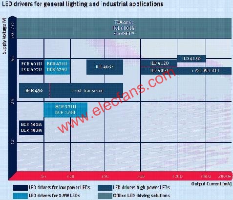 對于高功率LED而言, 開關模式驅動器是最常用的LED驅動器。英飛凌推出用于驅動高功率LED的全新ILD4xxx降壓轉換器。具備350mA典型輸出電流的ILD4035經過專門設計,可用于驅動1W LED。對于3W以上LED而言,英飛凌推出輸出電流分別為1200mA和1800mA的ILD4120和ILD4180。