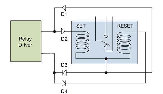 圖1:二極管可將單線圈繼電器驅(qū)動(dòng)器轉(zhuǎn)換為雙線圈使用。