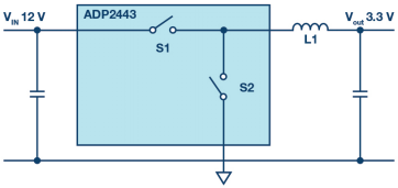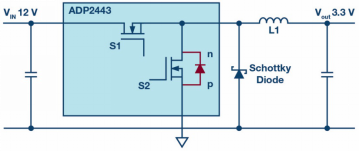 圖2.用于降壓轉(zhuǎn)換的同步開(kāi)關(guān)穩(wěn)壓器,采用N溝道MOSFET和額外的肖特基二極管,可最大限度地減少干擾。