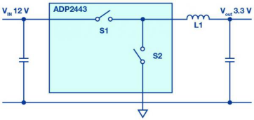 在負(fù)載點(diǎn)(POL)降壓轉(zhuǎn)換器領(lǐng)域,同步變化的高邊和低邊有源開關(guān)已被廣泛使用。圖1顯示了具有理想開關(guān)的此類電路。與使用無源肖特基二極管作為低邊開關(guān)的架構(gòu)相比,此類開關(guān)穩(wěn)壓器具有多項(xiàng)優(yōu)勢。主要優(yōu)勢是電壓轉(zhuǎn)換效率更高,因?yàn)榕c采用無源二極管的情況相比,低端開關(guān)承載電流時的壓降更低。