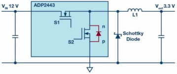 圖2.用于降壓轉(zhuǎn)換的同步開關(guān)穩(wěn)壓器,采用N溝道MOSFET和額外的肖特基二極管,可最大限度地減少干擾。