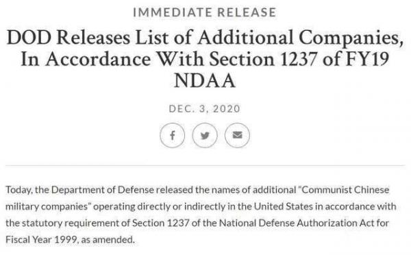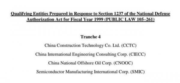 12月4日早間消息,當(dāng)?shù)貢r(shí)間周四,美國(guó)國(guó)防部官網(wǎng)宣布根據(jù)經(jīng)修訂的《 1999財(cái)政年度國(guó)防授權(quán)法》第1237條的法定要求,正式將中芯國(guó)際(SMIC)、中國(guó)建設(shè)科技集團(tuán)(CCTC)、中國(guó)國(guó)際工程咨詢公司(CIECC)、中海油(CNOOC)四家中國(guó)企業(yè)加入“軍事最終用戶”(Military End-User),此舉將使得美國(guó)企業(yè)在向這四家企業(yè)供應(yīng)相關(guān)技術(shù)或產(chǎn)品時(shí),需要獲得美國(guó)的許可。