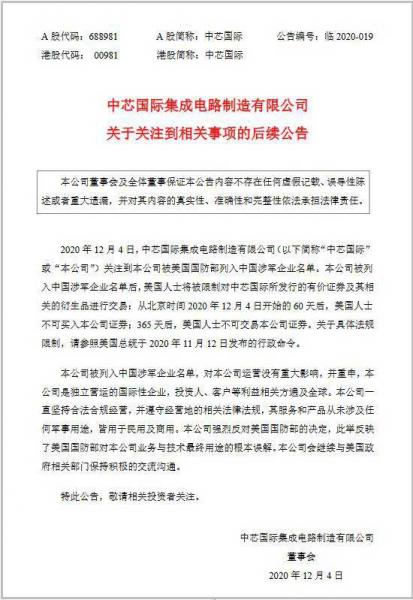 中芯國(guó)際表示,“已關(guān)注到本公司被美國(guó)國(guó)防部列入中國(guó)涉軍企業(yè)名單。本公司被列入中國(guó)涉軍企業(yè)名單后,美國(guó)人士將被限制對(duì)中芯國(guó)際所發(fā)行的有價(jià)證券及其相關(guān)的衍生品進(jìn)行交易:從北京時(shí)間 2020 年 12 月 4 日開始的 60 天后,美國(guó)人士不可買入本公司證券;365 天后,美國(guó)人士不可交易本公司證券。關(guān)于具體法規(guī)限制,請(qǐng)參照美國(guó)總統(tǒng)于 2020 年 11 月 12 日發(fā)布的行政命令。本公司被列入中國(guó)涉軍企業(yè)名單,對(duì)本公司運(yùn)營(yíng)沒有重大影響,并重申,本公司是獨(dú)立營(yíng)運(yùn)的國(guó)際性企業(yè),投資人、客戶等利益相關(guān)方遍及全球。本公司一直堅(jiān)持合法合規(guī)經(jīng)營(yíng),并遵守經(jīng)營(yíng)地的相關(guān)法律法規(guī),其服務(wù)和產(chǎn)品從未涉及任 何軍事用途,皆用于民用及商用。本公司強(qiáng)烈反對(duì)美國(guó)國(guó)防部的決定,此舉反映 了美國(guó)國(guó)防部對(duì)本公司業(yè)務(wù)與技術(shù)最終用途的根本誤解。本公司會(huì)繼續(xù)與美國(guó)政 府相關(guān)部門保持積極的交流溝通!