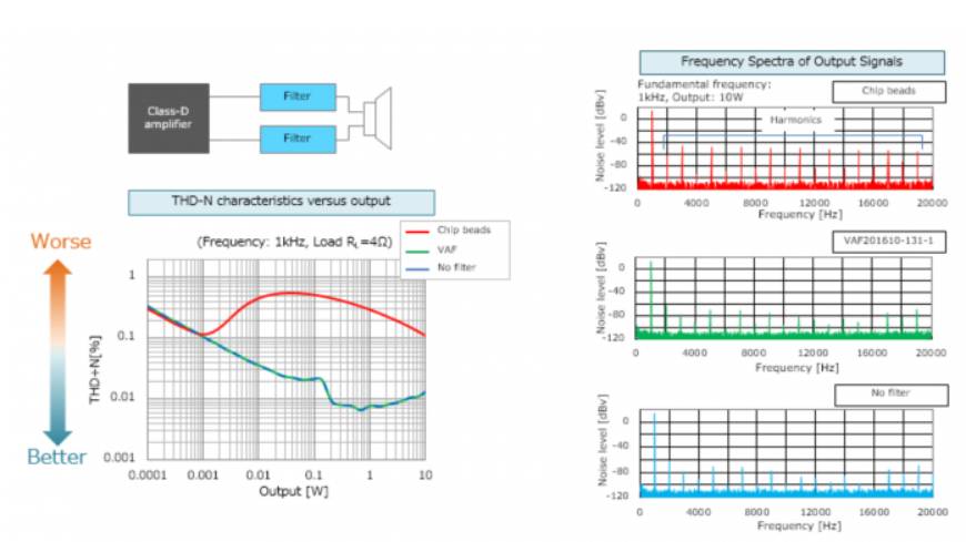 與不使用濾波器相比,噪聲抑制濾波器在輻射噪聲抑制方面的效果等同于關(guān)閉D類放大器時(shí)的效果。例如,TDK的MAF系列濾波器是多層芯片組件,它們使用一種新型的鐵氧體材料來(lái)實(shí)現(xiàn)低失真,同時(shí)保持其噪聲消除特性。