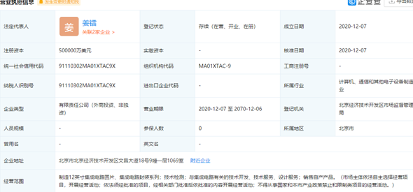 據(jù)企查查信息顯示,日前中芯國際正式成立了中芯京城集成電路制造(北京)有限公司,這個企業(yè)就是12月4日中芯國際公告的50億美金投資的公司。