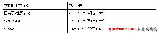 選擇輸入電壓范圍可以適應(yīng)電源的LDO。下表列出了便攜式設(shè)備所采用的、流行的電池化學(xué)物質(zhì)的電壓范圍。