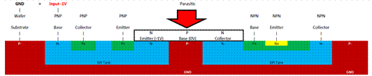 如圖4所標注,PNP管的發(fā)射極,P基底和NPN管的集電極構(gòu)成了一個寄生的NPN管,當運放的輸入低于-0.3V時(比如-1V),寄生的NPN管的發(fā)射極比基極低-1V,這個電壓足夠使得寄生的NPN管導(dǎo)通,從而引起電流從集電極流向基極,這樣,原本原本隔離開的兩個晶體管之間就有了電氣連接,同時與GND之間也有了電氣連接,芯片將無法正常工作。