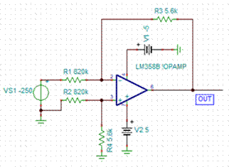 圖6是一個常見的電壓測量電路,LM358B由±5V供電,很容易可以推算出正常工作時Vout=VS1*(-R3/R1)=-250V*(-5.6/820)=1.71V。