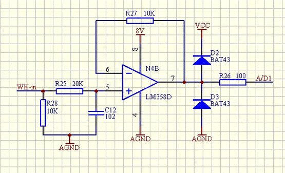 R25 的作用是消反射的,運(yùn)放的 5、6 角理論上是電壓相同的,且輸入阻抗是無(wú)窮大!那么輸入信號(hào)的電流主要是通過(guò) R28 流入地,也就是輸入點(diǎn)的電壓在 WK-in 點(diǎn)形成,理論上不會(huì)有電流流入 R25。如果沒(méi)有 R25,那么信號(hào)就會(huì) 100%反射到 WK-in 上。如果信號(hào)源的內(nèi)阻非常的大,也就是帶載的能力很差,反射的信號(hào)就會(huì)在 R28 的輸入點(diǎn)附近形成很強(qiáng)的發(fā)射震蕩,也就是“回音”這樣的噪聲,經(jīng)過(guò)放大就會(huì)使輸出信號(hào)質(zhì)量很差,R25 和 C12 的接入可以把在 5pin 的反射信號(hào)有效地吸收,高頻的反射信號(hào)通過(guò) C12 泄放到地(AGND)R25 把反射的信號(hào)阻隔在 5pin 的輸入端。