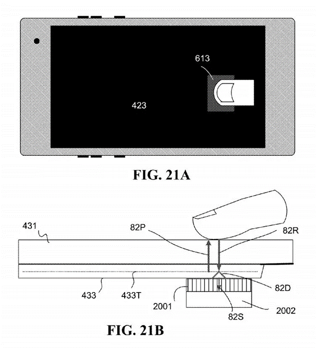 FIG.21A 和 FIG.21B 從俯視和側(cè)視兩個(gè)角度說(shuō)明了指紋識(shí)別傳感器放置的地方。