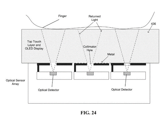 FIG.24 從微觀角度則說(shuō)明了光線是如何穿透 OLED 屏幕的,最上面的就是手指;偏上這層灰色區(qū)域就是手機(jī)的屏幕部分。透過(guò)屏幕的小孔,匯頂稱之為“準(zhǔn)直孔(Collimator Hole)”,手指反射回的光線光學(xué)傳感器搜集、處理。