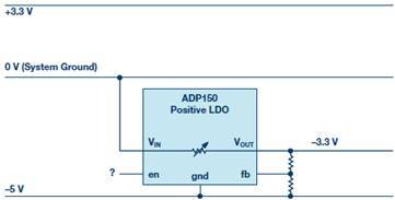 圖1顯示了用于這種應(yīng)用中的正線性穩(wěn)壓器。圖中的可調(diào)電阻代表線性穩(wěn)壓器的調(diào)整元件。對于這種線性穩(wěn)壓器IC來說,VIN、VOUT和GND連接器之間的電壓關(guān)系是完全相同的,就像在正電壓應(yīng)用中一樣。然而,在這種環(huán)境中使用正線性穩(wěn)壓器有幾個缺點。該電路將使用電阻分壓器來調(diào)節(jié)基于–5V電壓軌的輸出電壓,而不是基于0V電壓軌、系統(tǒng)地。這會導(dǎo)致–5V電壓軌上的干擾和噪聲直接耦合到產(chǎn)生的–3.3V軌上。此外,穩(wěn)壓精度也相當差。當–5V電源電壓精度只有±10%時,這個不精確度也會耦合到–3.3V產(chǎn)生的輸出電壓上。