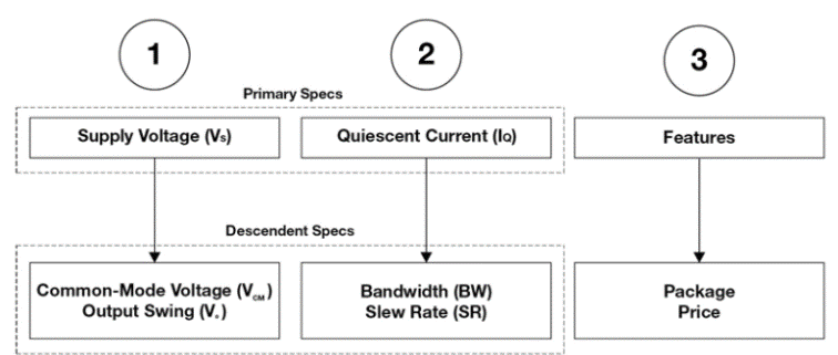 本文的目的是說(shuō)明一種簡(jiǎn)化的過(guò)程,該過(guò)程集中于選擇運(yùn)算放大器時(shí)的三個(gè)主要考慮因素,如圖1所示。前兩個(gè)考慮因素是電源電壓(Vs)和靜態(tài)電流(IQ)的主要規(guī)格)及其相應(yīng)的規(guī)范。次要規(guī)范定義為直接依賴于主要規(guī)范的規(guī)范。選擇一個(gè)沒(méi)有適當(dāng)?shù)闹饕?guī)格和次要規(guī)格的運(yùn)算放大器可能不適用于該應(yīng)用。第三個(gè)也是最后一個(gè)考慮因素涉