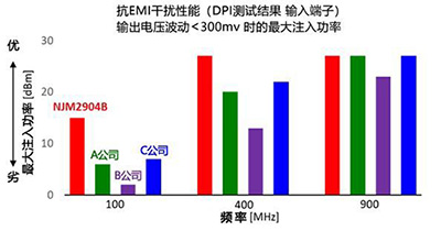 NJM2904B / NJM2902B 是遵照國(guó)標(biāo)IEC 62132-4※3以及JEITA標(biāo)準(zhǔn)ED-5008※4的適當(dāng)基準(zhǔn),進(jìn)行了產(chǎn)品比較和測(cè)試,確定獲得了業(yè)界頂級(jí)水準(zhǔn)的抗干擾性能,在新品研發(fā)設(shè)計(jì)和探討更換部件時(shí),您可放心使用此款運(yùn)算放大器。