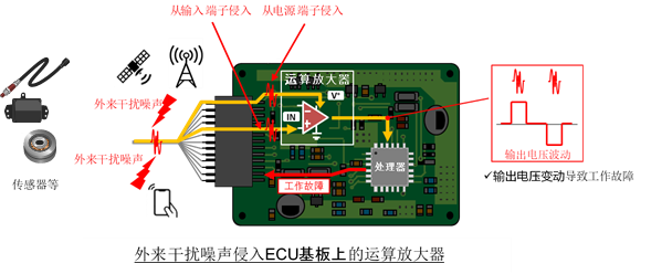 汽車(chē)ECU上使用的運(yùn)算放大器當(dāng)受到超出工作頻率的外來(lái)電磁波噪聲(EMI)干擾,輸出電壓就會(huì)產(chǎn)生波動(dòng),這將造成ECU出現(xiàn)工作故障。
