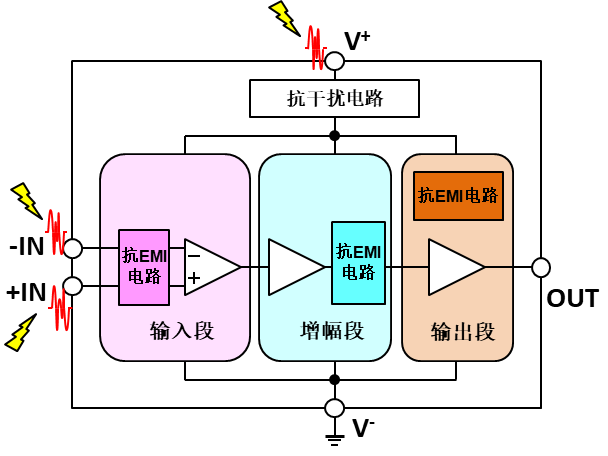 運(yùn)算放大器的EMI干擾一般是從抗EMI干擾性能比較薄弱的輸入端子侵入,所以大多只對(duì)輸入端子實(shí)施EMI抗干擾對(duì)策。但是,考慮到疊加在線束上的干擾噪聲會(huì)從放大器的電源端子侵入,所以至此的干擾對(duì)策還不算完全。