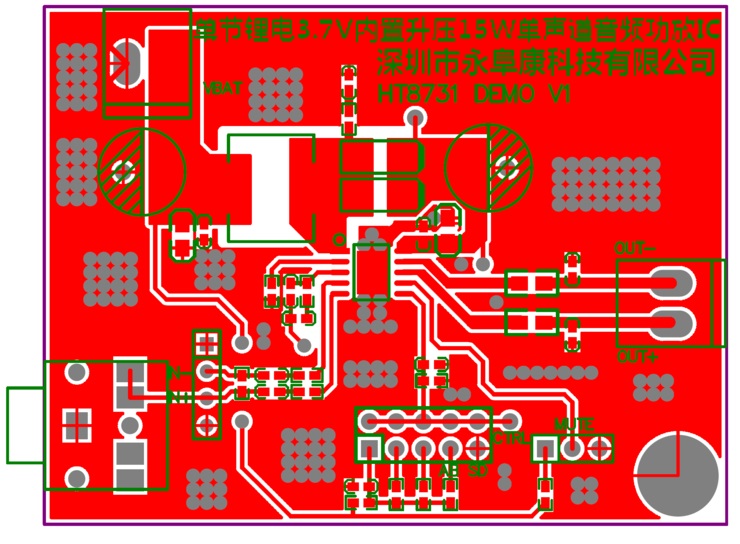 HT8731是一款內(nèi)置自適應(yīng)H類(lèi)升壓的單聲道D類(lèi)音頻功率放大器, 由鋰電池供電時(shí),THD+N<1%、20-20kHz全頻段信號(hào)條件下,能連續(xù)輸出6W功率(4Ω負(fù)載);另外,其還支持AB類(lèi)模式。