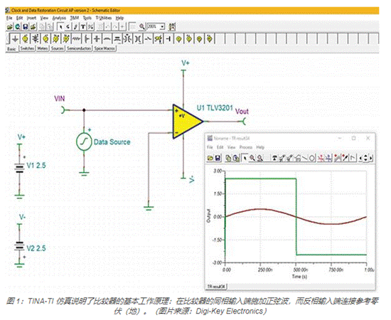 所用比較器采用 Texas Instruments 的 TLV3201AQDCKRQ1 單比較器,該器件具有推挽輸出。像所有比較器一樣,該器件有兩個(gè)輸入。帶負(fù)號(hào) (-) 的反相輸入和帶正號(hào) (+) 的同相輸入。比較器輸入非常類似于運(yùn)算放大器輸入。主要區(qū)別在于比較器輸出是數(shù)字邏輯狀態(tài)而非模擬電壓。在圖 1 中,輸入是幅值為 200 毫伏 (mV) 的 1 兆赫茲 (MHz) 正弦波。當(dāng)同相輸入端的電壓大于反相輸入端的電壓時(shí),輸出將處于高電平狀態(tài),此時(shí)為 2.5 伏。當(dāng)同相輸入端的電壓低于反相輸入端的電壓時(shí),輸出將變?yōu)榈碗娖綘顟B(tài),此時(shí)為 -2.5 伏。該比較器具有軌至軌輸出,因此輸出邏輯狀態(tài)可擴(kuò)展到電源電平。本例中,使用對(duì)稱的 2.5 伏正負(fù)電源并且反映在輸出電壓擺幅中。