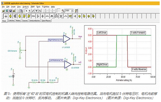 窗口可用于機(jī)器人技術(shù),通過光線和兩個(gè) CDS 光電管來控制機(jī)器人的移動(dòng)方向。例如,硫化鎘 (CDS) 光電池在燈光下會(huì)改變電阻,黑暗環(huán)境下電阻較高而燈光下則電阻較小。TINA-TI 仿真使用 Texas Instruments LM393BIPWR 雙比較器說明了這一原理(圖 5)。