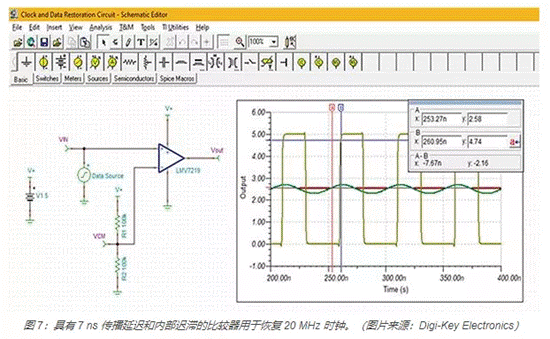 通過背板和電纜傳輸?shù)臅r(shí)鐘信號(hào)會(huì)因帶寬限制、碼間干擾 (ISI)、噪聲、反射和串?dāng)_導(dǎo)致性能下降。比較器可用于恢復(fù)時(shí)鐘信號(hào)并將其恢復(fù)為更清晰定義的形式(圖 7)。