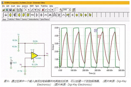 通過使用正負(fù)反饋,可以將比較器配置為弛張振蕩器(圖 6)。