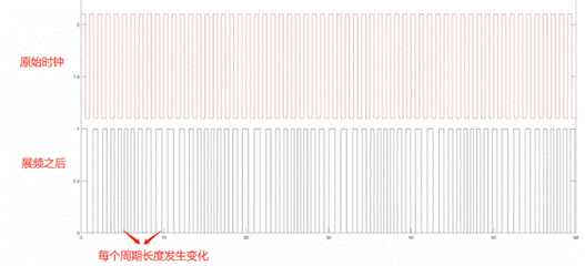 原本的時鐘信號每個周期都是一樣的,周期時間長度也一樣,為Tclk。我們可以對其進(jìn)行微調(diào),比如先將每個時鐘周期比上一個時鐘周期的時間加長一點(diǎn)點(diǎn),累計n個周期之后,再將每個時鐘周期比上一個時鐘周期縮短一點(diǎn)點(diǎn),再累計n個周期,如此循環(huán)。
