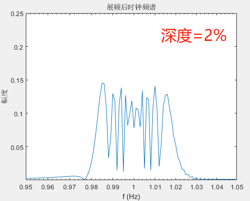 將調(diào)制速度從0.001改為0.0001,即降低10倍,調(diào)制深度為2%,頻譜如下圖。